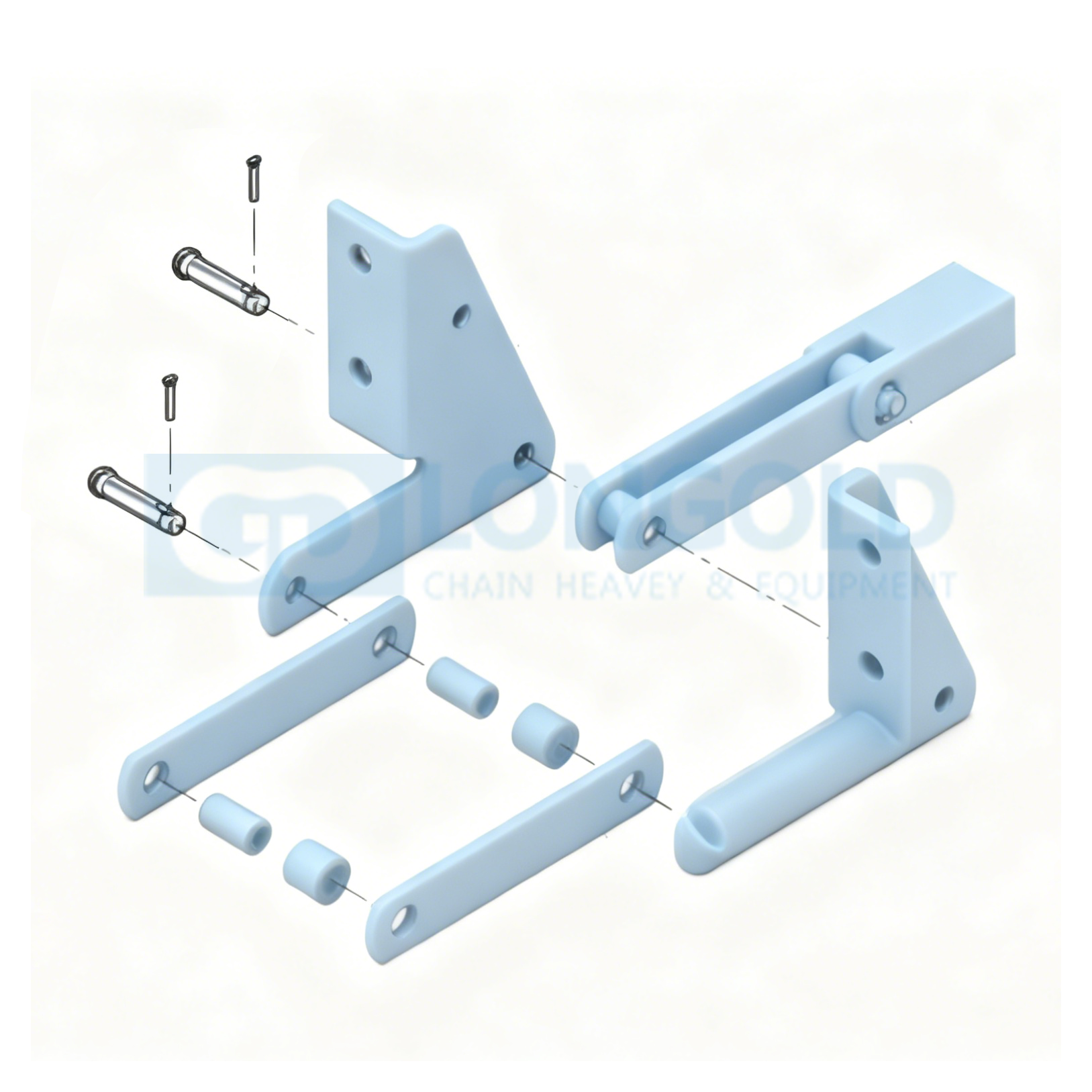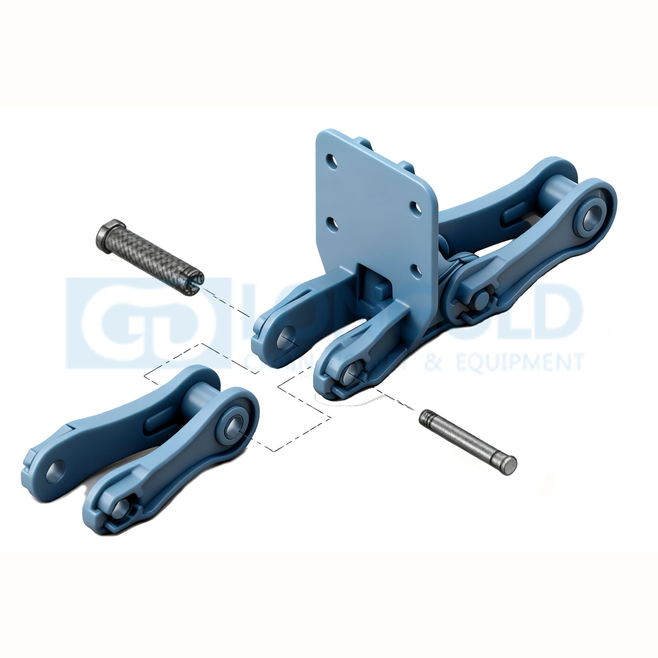 由于需要與污水直接接觸,所以這兩款規(guī)格的污水處理鏈除銷軸外,其它部件均采用工程塑料材質(zhì)。